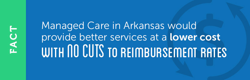 FACT: Governor's Proposed Bill of Rights Promises No Cuts To Reimbursement Rates. A proposed bill of rights supported by Governor Asa Hutchinson requires that all MCOs continue the exact same reimbursement rate as today to guarantee savings are not achieved by cutting payments to providers. (Talk Business, 3/22/16)